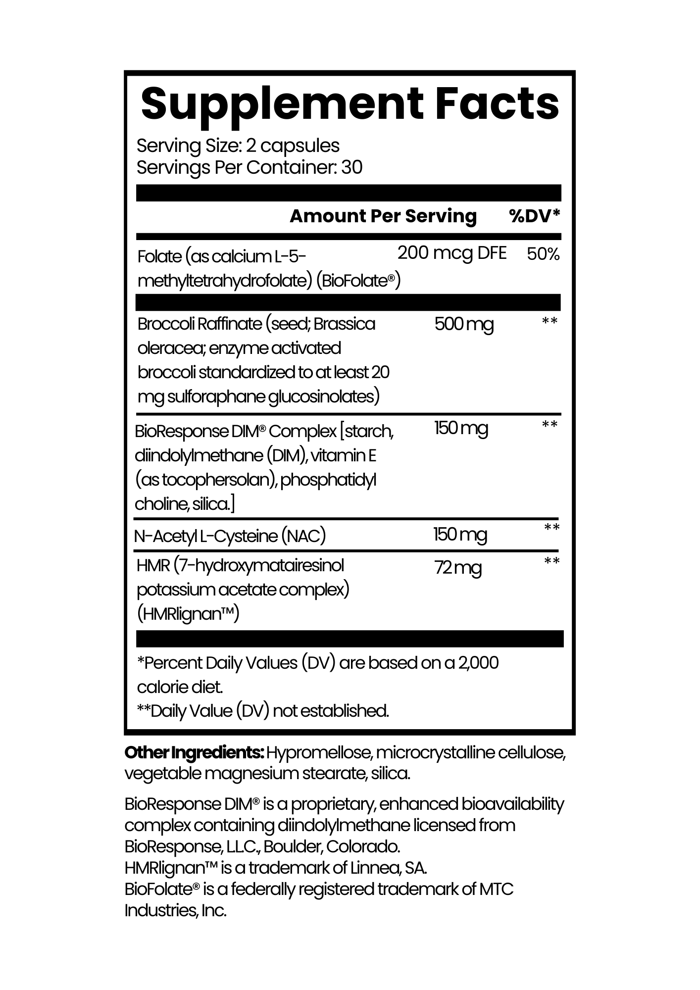 Folate (as calcium L-5-methyltetrahydrofolate) (BioFolate®), Broccoli Raffinate (seed; Brassica oleracea; enzyme activated broccoli standardized to at least 20 mg sulforaphane glucosinolates), BioResponse DIM® Complex [starch, diindolylmethane (DIM), vitamin E (as tocophersolan), phosphatidyl choline, silica.], N-Acetyl L-Cysteine (NAC), HMR (7-hydroxymatairesinol potassium acetate complex) (HMRlignan™),